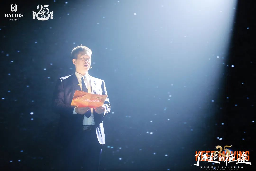 百君25周年庆典活动以“了不起的征途”为主题,我认为这不仅是总结过去走过的历程,更是一个全新的开始,是一个突破区域和一般法律服务的全新开始,这条路很远、很艰辛,但一定很美、很有意义,值得大家一起努力与追求。